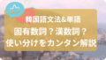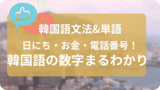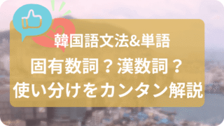 単語 韓国語の数字の使い分け|固有数詞と漢数詞の違いと例文をわかりやすく解説 韓国語の固有数詞とは?年齢・人数・時間などの使い方を例文つきでやさしく解説。助数詞との組み合わせや漢数詞との違い、初心者がつまずきやすい使い分けのコツも丁寧に紹介しています。 2025.07.15 単語文法