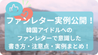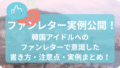 韓国語学習の呟き ファンレターの実例公開!韓国アイドルに送る際に意識した書き方・注意点・実例まとめ 韓国アイドルにファンレターを送る時の書き方やマナー、注意点を解説。実際に送ったファンレターの実例も公開!何を書けばいいかわからない方にも役立つ内容です。 2025.07.23 韓国語学習の呟き