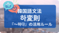 文法 韓国語の【하変則】とは?『~하다』動詞・形容詞の活用(해요/했어요)をマスター 韓国語の하変則とは?『~하다』動詞の活用ルールを解説。해요/했어요の使い方を例文付きでわかりやすく紹介します。初心者からTOPIK受験生まで役立つ必須知識をまとめました。 2025.08.28 文法