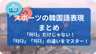 文法 韓国語のスポーツ動詞まとめ「하다」だけじゃない!「타다」「치다」自然な言い方と例文集 韓国語で話をするとき、「운동하다(運動する)」や「(名詞)+하다」と言うことが多いですよね。でも実は、すべてのスポーツに「하다」を使えるわけではありません!たとえば「ゴルフをする」と言いたいとき、「골프를 하다」は不自然で、正しくは「골프를... 2025.10.15 文法